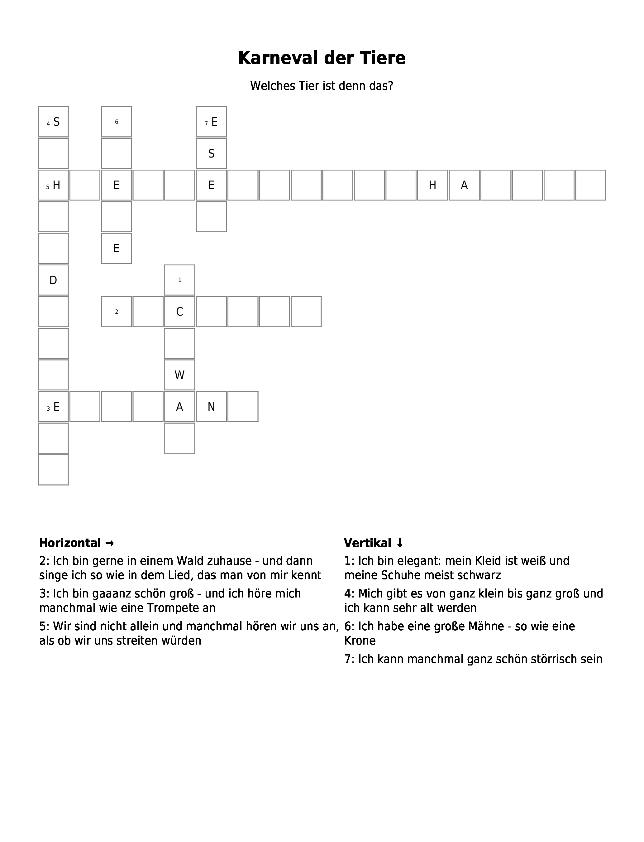 Aufgrund der Thematik Tiere eignet es sich besonders hervorragend für den Einsatz im Musikunterricht der Grundschule. Im rätsel sind einige buchstaben vorgegeben. Neue Arbeitsblätter bei uns zum Karneval der Tiere von Camille Saint-Saëns für Musik in der Grundschule.