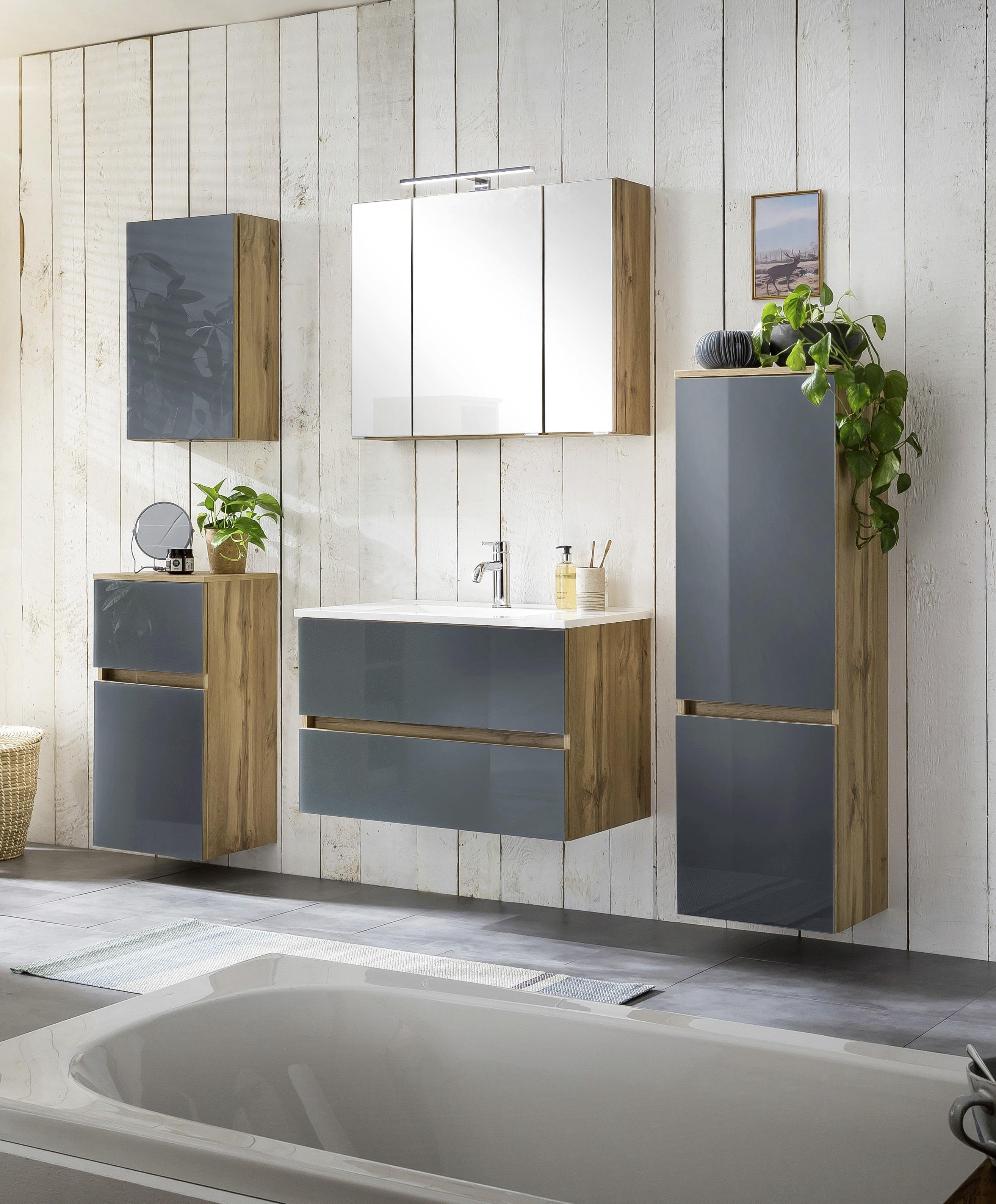 Badmöbel Set OLIVIA 80 GRAU Hochglanz mit Waschbecken montiert. Badmöbel Sets kaufen Sie günstig auf Wohnende Kostenloser Versand Retoure Große Auswahl Kauf auf Rechnung und Raten. 1438-903-03 64999 Kostenloser Versand Weitere Farben Badmöbel Set FYNN Weiß Eiche Sonoma - Badezimmer Spiegel Waschtisch Kommode.